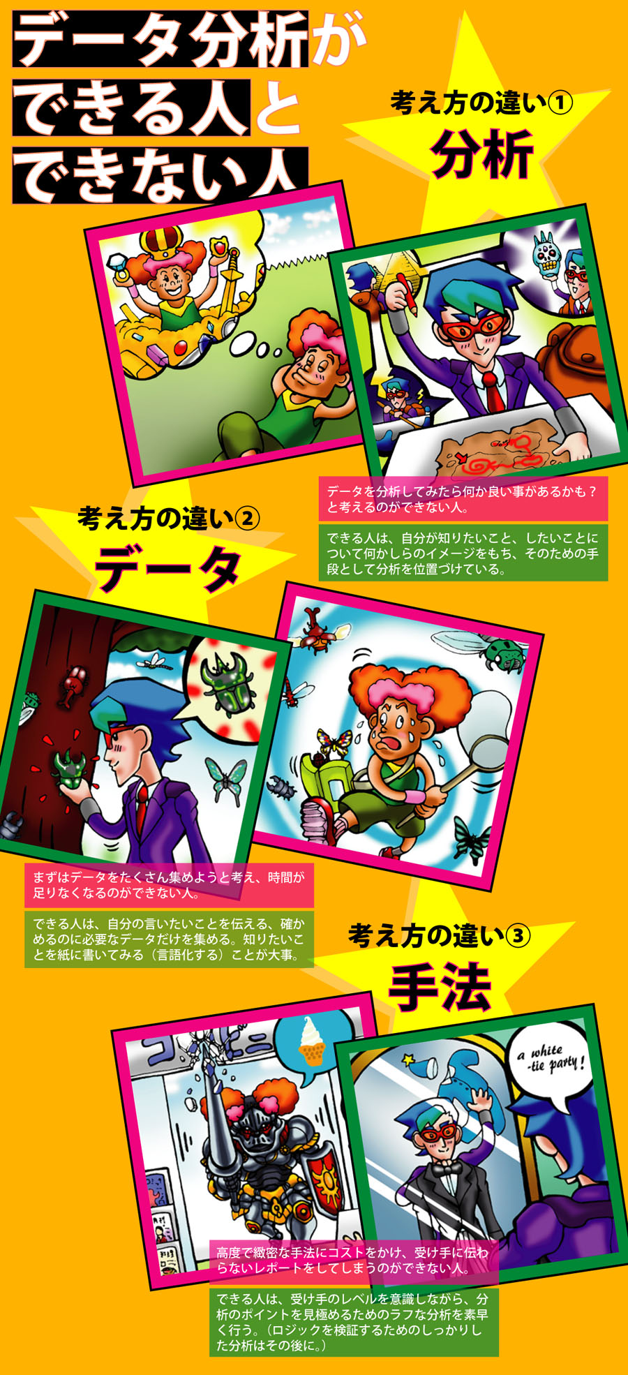 『「それ、根拠あるの?」と言わせない データ・統計分析ができる本』をから、データ分析に必要な考え方のポイントをまとめてみました。主には「序章 データ・統計分析のための発送とコツ」「第1章 効果的なデータ分析のための集め方と分析の視点」を参考にしています。